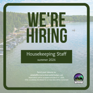 Browns’ Clearwater West Lodge is currently searching for an energetic and detail oriented housekeeper to join our team this upcoming season. The right individual will have a team-centric approach to any large scale challenges that arise and the ability to work independently, self-start and hone in on fine details to ensure a high level of sanitation throughout camp. The successful candidate will be responsible for cleanliness in all cabins, outposts, public and staff areas both here at the main Lodge as well as at our Outpost camps. The candidate(s) must be physically able to lift 50lbs, prioritize tasks, work in strenuous environments and endure exposure to the elements. There will be adventures (and bugs, let’s be real, we live in Northwestern Ontario so there will be bears too and a whole host of other critters), so experience in remote settings, on boats, with docks and living off-grid is an asset!